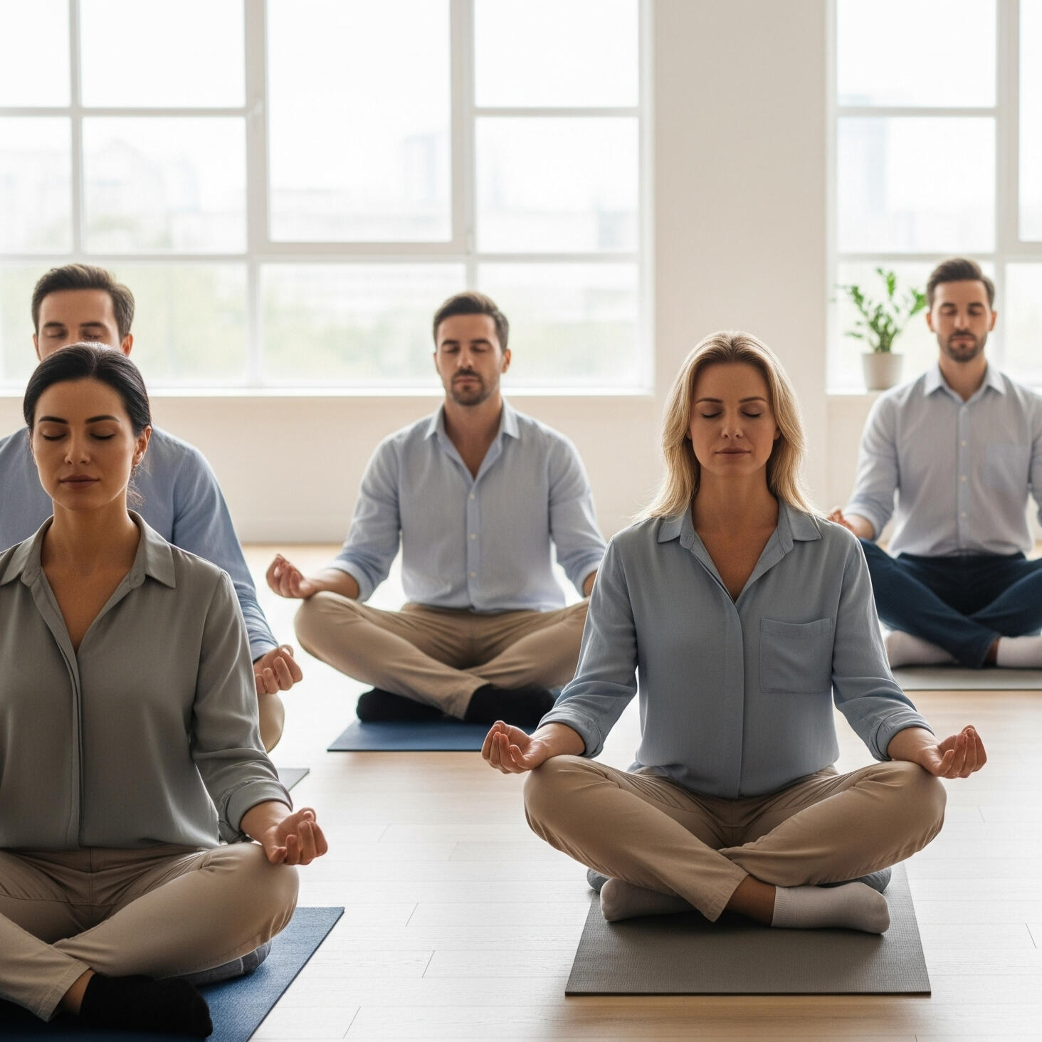 Practice: Dynamic yoga–breath flows · Mobility & postural alignment · Focused meditation · Leadership reflections & application👉 Active, performance-oriented — enhances mobility, sustains energy, and elevates presence during demanding schedules.Audience: Leaders balancing travel, meetings, and demanding schedulesFormat: 2×30-min live virtual sessions/week · 8 weeks